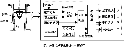 金属管浮子流量计结构原理图如图1所示。其中,传感器由一个锥形管、一个置于锥形管内可以上下自由移动的浮子(内嵌磁钢)组成,虚线部分为信号处理单元。